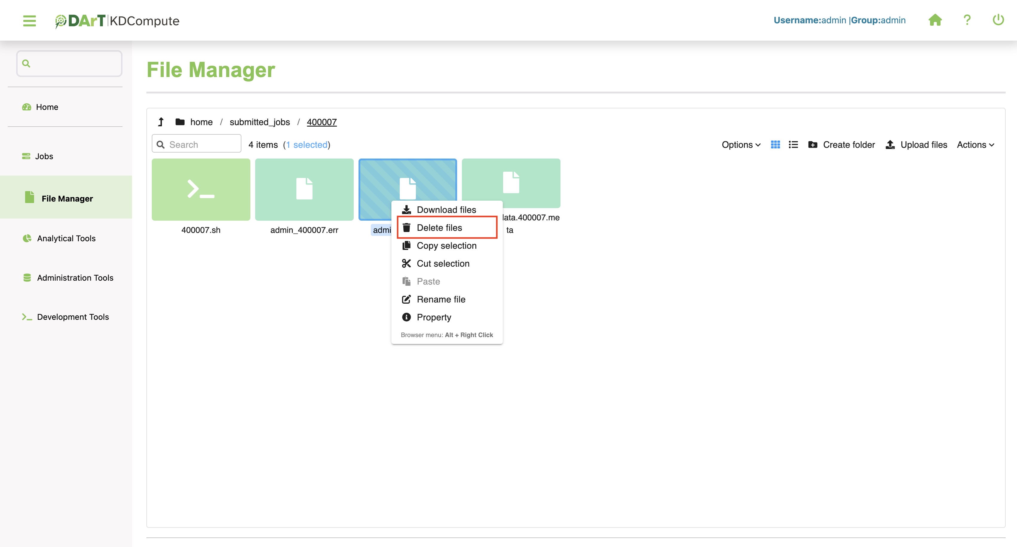 Files and folders may be deleted from the KDCompute web server when no longer needed. To delete a file or folder: