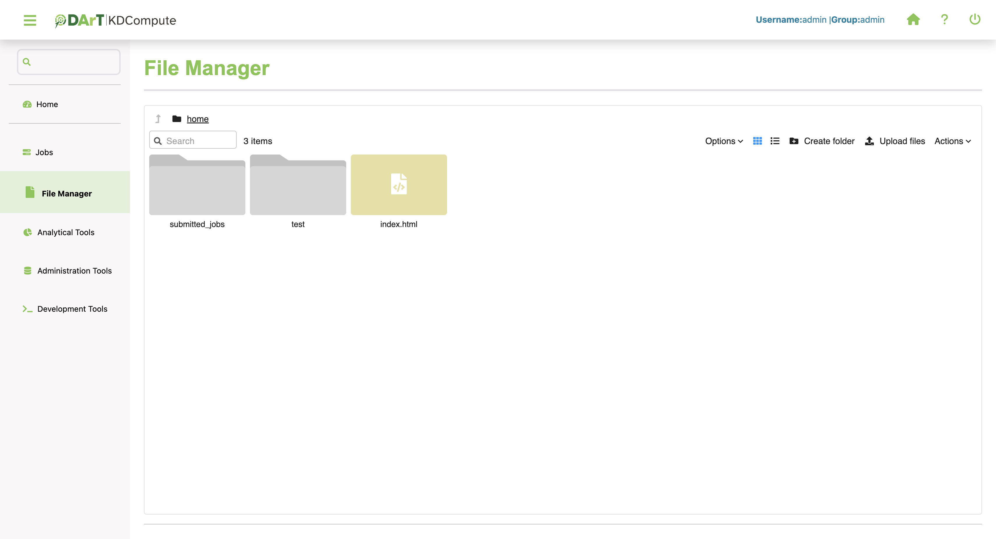 The File manager provides operations to manage user files on the webserver. The webserver is the computer server where the KDCompute application is hosted (i.e. lives) and performs the algorithms by users. Any files, input or output, required by an algorithm must be located on the webserver to allow the algorithm to operate.