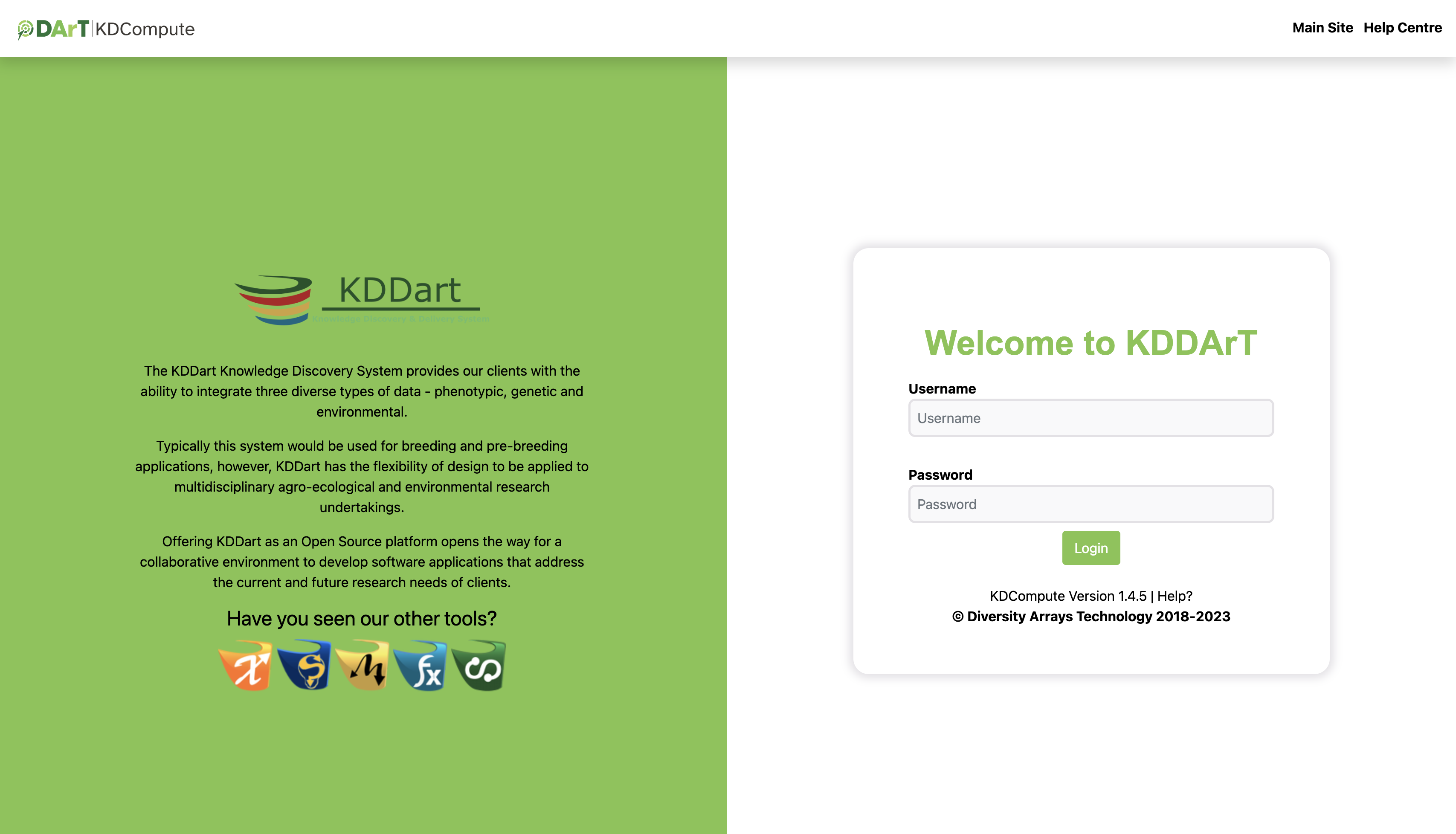 To commence using KDCompute, you need a valid KDDart userid and password to login/authenticate to the database.