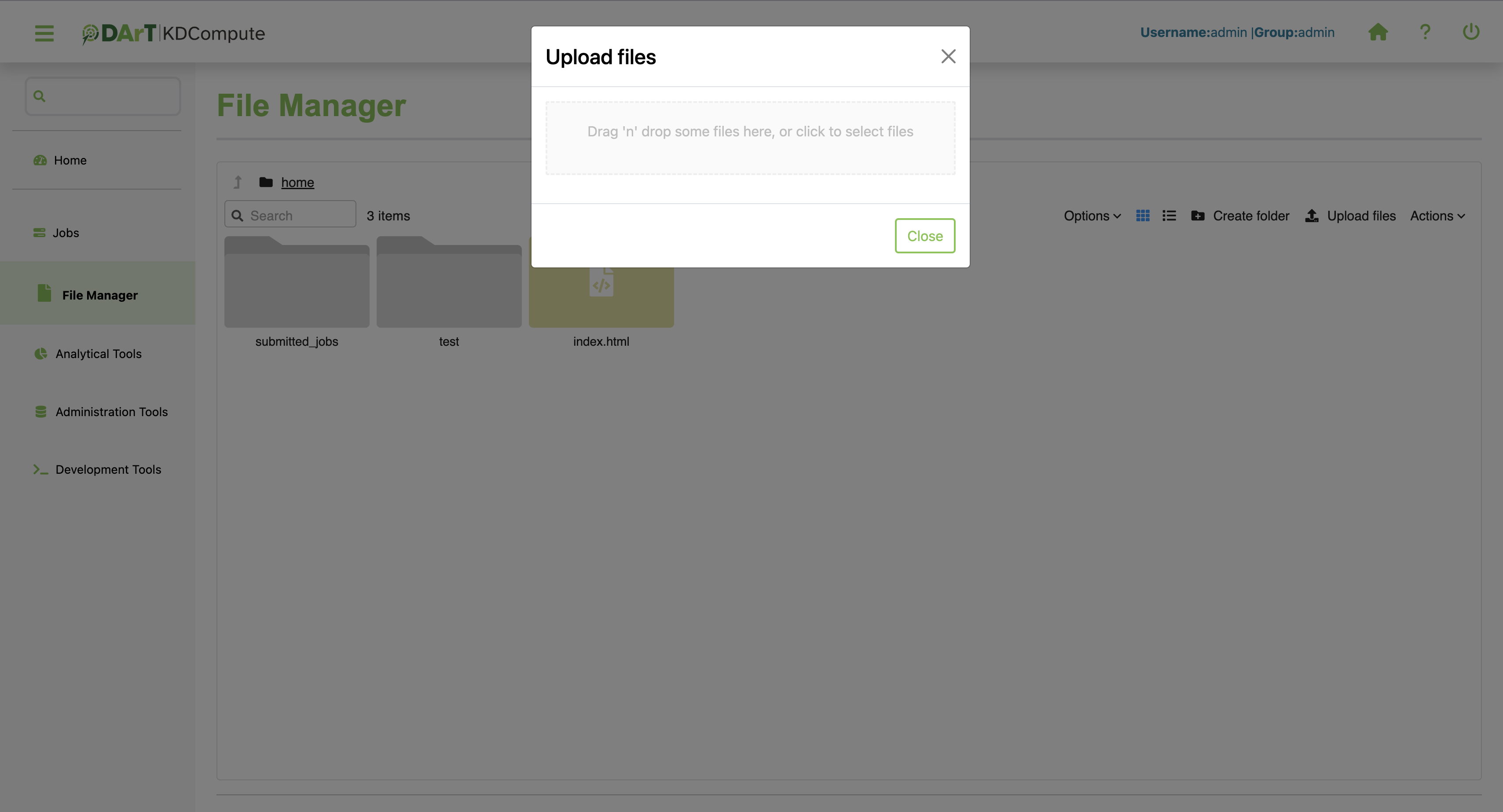 Files needed by an algorithm must first be uploaded to the server for processing. The following steps outline how to upload a file to KDCompute: